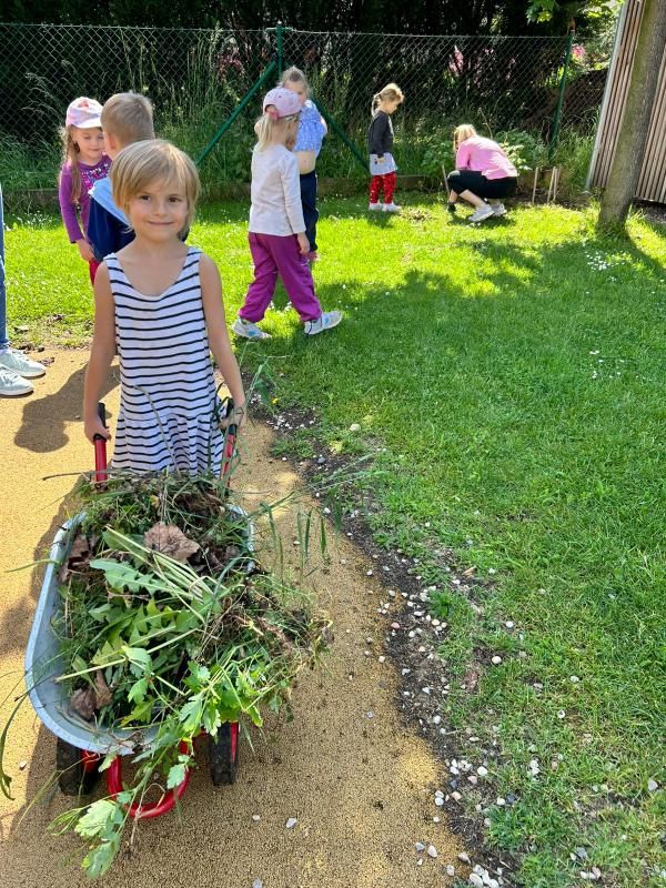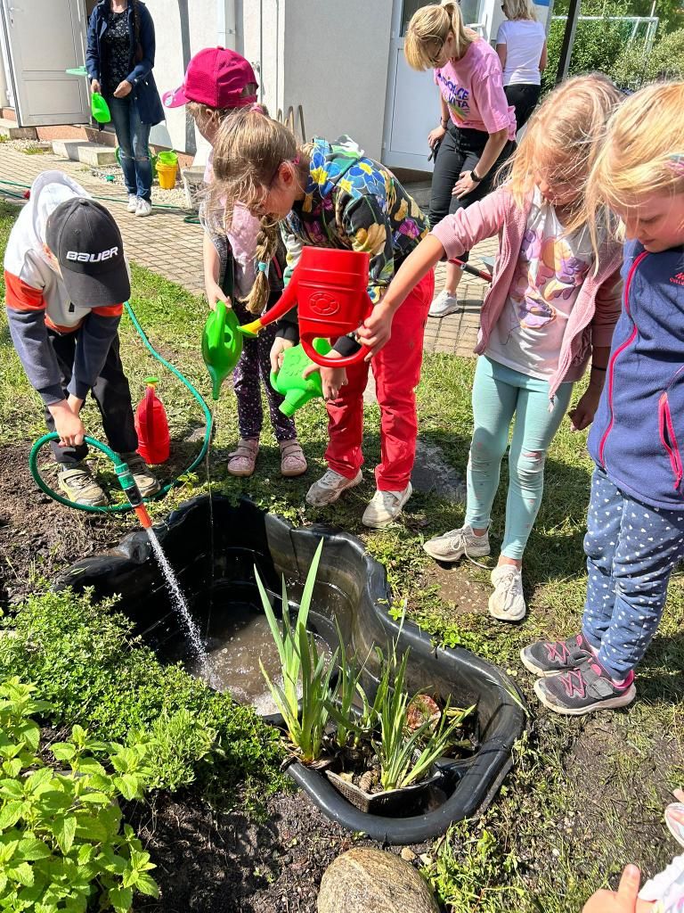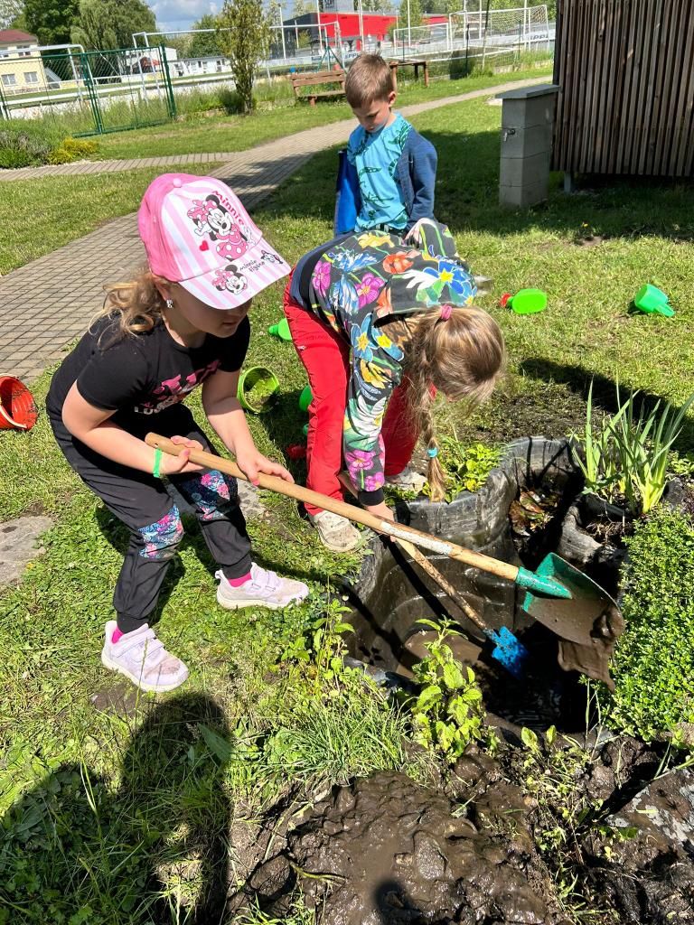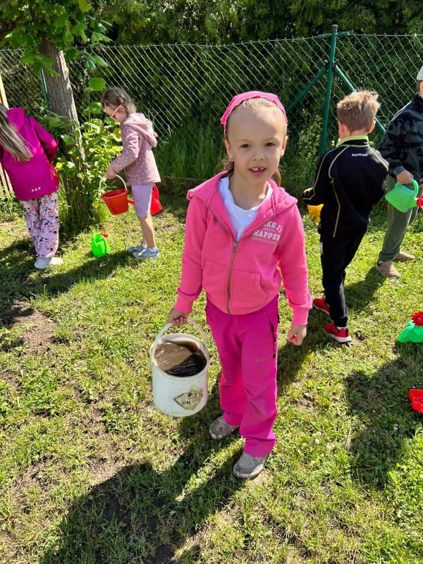 Na školní zahradě jsme v rámci Ekoškolky vybudovali před několika roky jezírko. Pěstujeme v něm lekníny, kosatce, je zdrojem pitné vody pro živočichy a dokonce se nám v něm zabydlela žabička. Děti se tak učí vztahu k přírodě, poznávají rostliny, živočichy, učí se o ně starat a chránit je. Protože děti zjistily pozorováním jezírka, že nám do něj bohužel nějaký vandal naházel hlínu a drny a tak nám jezírko znečistil, rozhodly se s paními učitelkami, že musí jezírko vyčistit. Tak jsme se domluvili na malém ekotýmu a naplánovali čištění jezírka na květen 2025. Nejprve jsme si s dětmi rozdělili úkoly a řekli si, jaké nářadí budeme k práci potřebovat. V úterý jme se setkali na zahradě a nejprve děti lopatkami vybraly hlínu(spíš bahno a odnesly na kompost), pomocí kbelíčků vybraly znečistěnou vodu a potom jsme napustili hadicí vodu čistou. Domluvili jsme se, že paní ředitelka koupí nový leknín, protože nám bohužel jeden zahynul. Děti ze třídy Tygříků a Kuřátek ještě stihly protrhat plevel na záhonu malin a děti tak mohou pozorovat, jak nám maliny porostou.