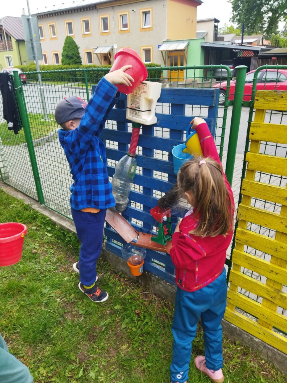 Z Analýzy tématu prostředí jsme s dětmi zjistili, že dříve vybudovaný koloběh vody , původně sloužící jako herní prvek pro děti na zahradě MŠ je poškozený a nefunkční.  Z průzkumu v MŠ bylo patrné, že děti o tento herní prvek mají zájem, nechtějí o něj přijít a tak se  Ekotým  pokoušel vymyslet, jak by se jej dalo opravit, aby byl pro děti opět použitelný a oprava nebyla příliš nákladná.  Jedním ze členů Ekotýmu  byl vznesen velmi podnětný nápad,  oslovit rodiče,  zda nemají v domácnostech nějaké nepotřebné předměty, které by bylo možné využít při rekonstrukci koloběhu vody.  Ekotým složený z dětí ze všech 4 tříd vyrobil  do svých šaten plakáty s informací o našem záměru. Od rodičů  se podařilo shromáždit velké množství materiálu, který nám zajistil možnost vrhnout se do oprav. Ekotým v následném období postupně nejen opravil herní část Koloběhu vody, ale vytvořil i jeho druhou část – edukační (žlutá paleta). Zde mají možnost děti s učitelkami kdykoliv sestavit pomocí zalaminovaných obrázků ( ty jsou umístěny ve slídě i s omalovánkami ve venkovních prostorách MŠ  určených k venkovnímu tvoření) svůj koloběh a šipkami naznačit jak to v tom světě s tou kapkou vody vlastně je ( podle svého uvážení či s dopomocí plánku – dle schopností a věku dětí) .  Tímto plánem činností se nám podařilo propojit obě naše témata, kterými se  aktuálně v MŠ zabýváme = Prostředí a Odpady.  Neboť z nepotřebných věcí v různých domácnostech se nestal odpad, nýbrž důležitý stavební materiál pro náš herní prvek.