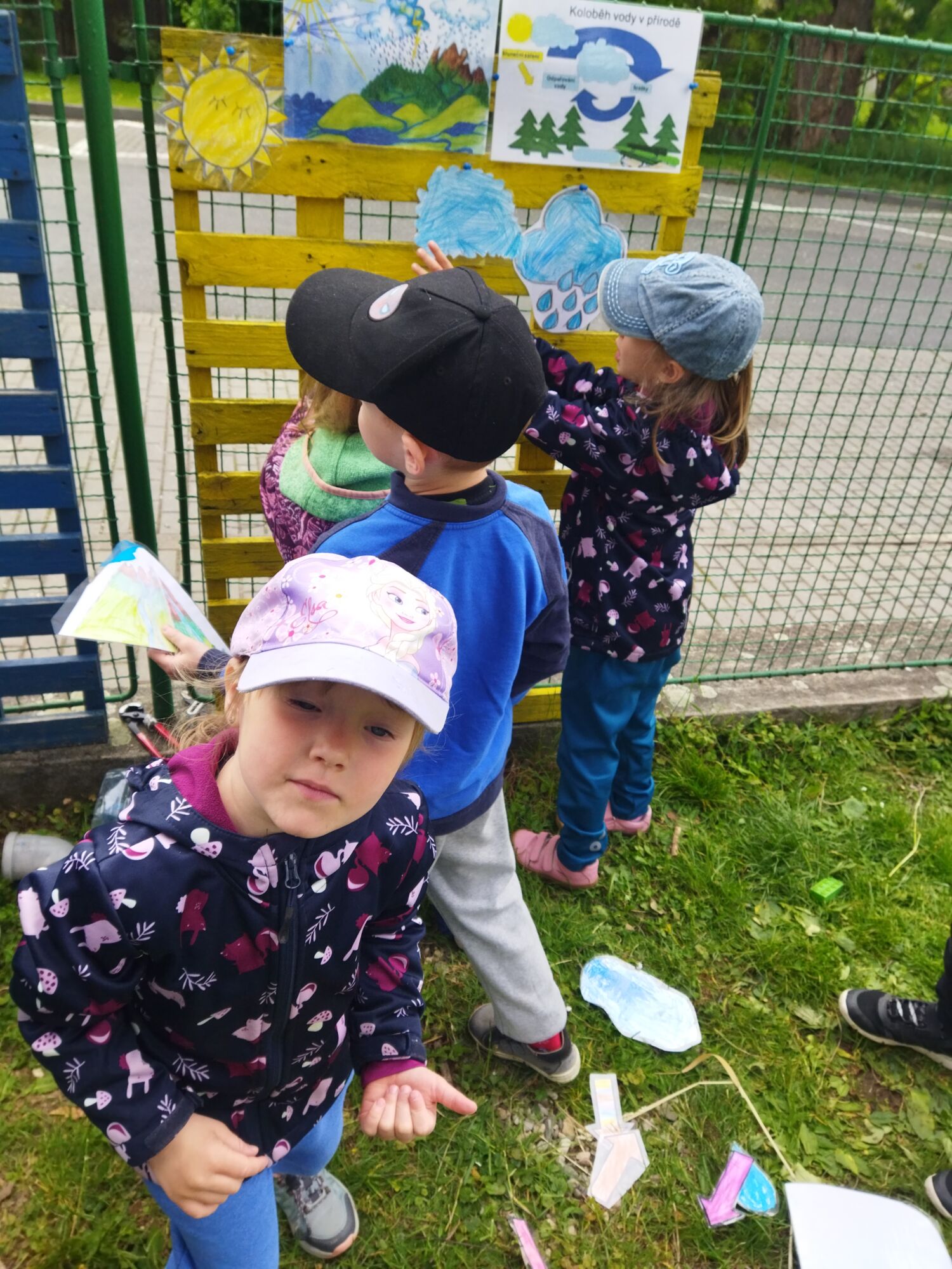 Z Analýzy tématu prostředí jsme s dětmi zjistili, že dříve vybudovaný koloběh vody , původně sloužící jako herní prvek pro děti na zahradě MŠ je poškozený a nefunkční.  Z průzkumu v MŠ bylo patrné, že děti o tento herní prvek mají zájem, nechtějí o něj přijít a tak se  Ekotým  pokoušel vymyslet, jak by se jej dalo opravit, aby byl pro děti opět použitelný a oprava nebyla příliš nákladná.  Jedním ze členů Ekotýmu  byl vznesen velmi podnětný nápad,  oslovit rodiče,  zda nemají v domácnostech nějaké nepotřebné předměty, které by bylo možné využít při rekonstrukci koloběhu vody.  Ekotým složený z dětí ze všech 4 tříd vyrobil  do svých šaten plakáty s informací o našem záměru. Od rodičů  se podařilo shromáždit velké množství materiálu, který nám zajistil možnost vrhnout se do oprav. Ekotým v následném období postupně nejen opravil herní část Koloběhu vody, ale vytvořil i jeho druhou část – edukační (žlutá paleta). Zde mají možnost děti s učitelkami kdykoliv sestavit pomocí zalaminovaných obrázků ( ty jsou umístěny ve slídě i s omalovánkami ve venkovních prostorách MŠ  určených k venkovnímu tvoření) svůj koloběh a šipkami naznačit jak to v tom světě s tou kapkou vody vlastně je ( podle svého uvážení či s dopomocí plánku – dle schopností a věku dětí) .  Tímto plánem činností se nám podařilo propojit obě naše témata, kterými se  aktuálně v MŠ zabýváme = Prostředí a Odpady.  Neboť z nepotřebných věcí v různých domácnostech se nestal odpad, nýbrž důležitý stavební materiál pro náš herní prvek.